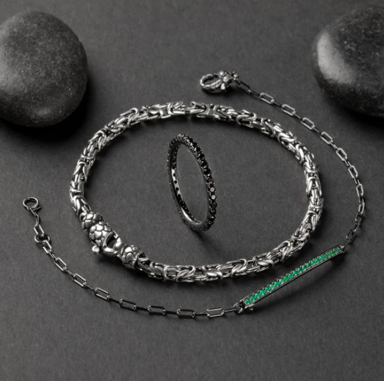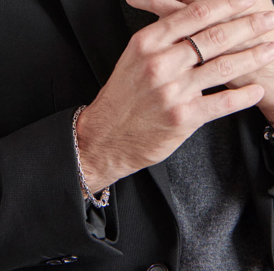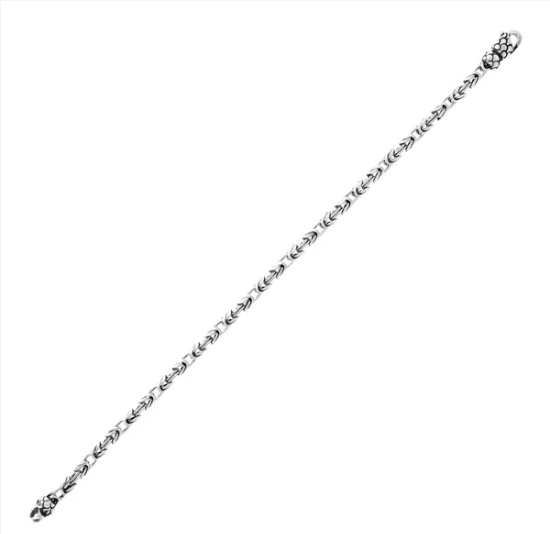 Bracciale uomo Albert M. in Argento 925, placcato Rodio, con catena bizantina; chiusura a moschettone con texture sirena. Disponibile in due misure: small (19 cm) e large (20 cm). Argento 925 Designed and Made in Italy Ipoallergenico Materiale: Argento Sterling 925 Lunghezza (cm): 19 Peso (g): 13