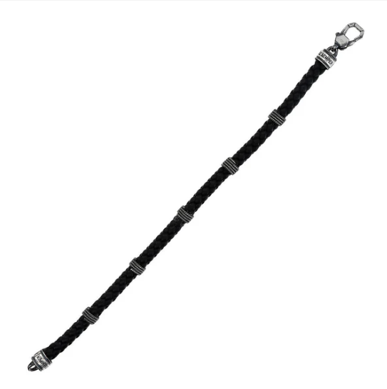 Bracciale uomo Albert M. in ecopelle nero (5 mm di spessore) dal design a intreccio con rondelle texture in Argento 925. Lunghezza 20.5 cm. Chiusura a moschettone squadrato. Argento 925 Designed and Made in Italy Ipoallergenico Materiale: Argento Sterling 925 Lunghezza (cm): 20.5 Peso (g): 9.5