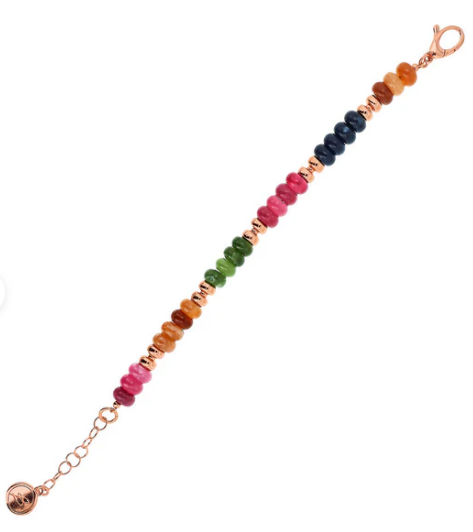 Bracciale Bronzallure realizzato in lega Golden Rosé, placcata Oro rosa 18kt, con piccole rondelle lucide alternate a rondelle in pietra naturale di tormalina e quarzite multicolore. Lunghezza 17+3 cm di estensione. Chiusura a moschettone. Lega brevettata Golden Rosé Pietre Naturali Selezionate Designed and made in Italy Nickel free, cadmium free Ipoallergenico Materiale: Golden rose Lunghezza (cm): 17 Lunghezza extender (cm): 3 Peso (g): 18.6