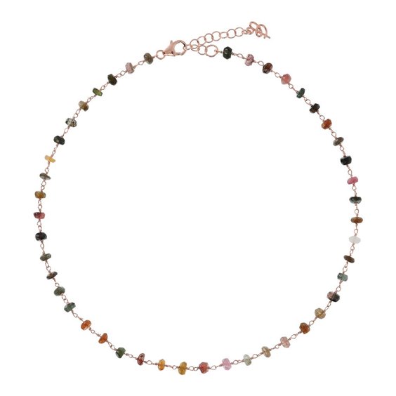 Rosario in Golden Rosè , lega brevettata placcata oro rosa 18kt con tormaline di vari colori (pietre certificate Bronzallure)cm 42 e catena finale per regolare la misura . Certificato d'autenticità Bronzallure , made in Italy .