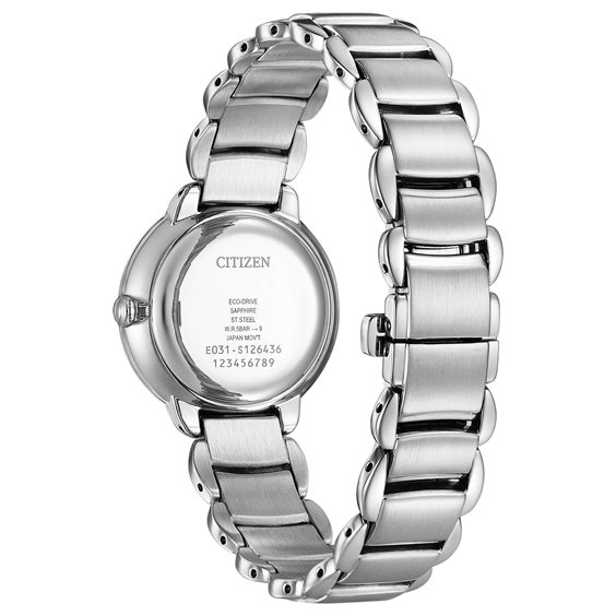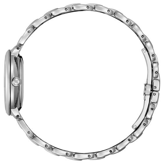 Orologio solo tempo donna della collezione Citizen L. Cassa in acciaio lucido diametro di 28 mm. con bracciale integrato e regolabile lucido e satinato, chiusura deployante con pulsanti a scomparsa. Movimento Eco-Drive a carica luce con riserva di carica di 8 mesi. Vetro zaffiro antigraffio leggermente bombato. Quadrante madreperla con diamante a ore 6 , indici e lancette lucide. Impermeabile 5 bar (atm). Scatola Certificato Diamante Libretto Istruzioni e Garanzia 2 anni Originali.