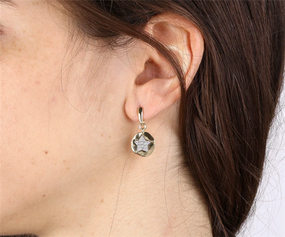 Orecchini stella pendenti delicati e dal carattere elegante e sofisticato impreziositi da un elemento centrale micropave in Cubic Zirconia e con placcatura generosa in caldo oro giallo 18KT ispirato ai classici della gioielleria artigianale made in Italy. Qui la luminosità del Cubic Zirconia si accompagna ai riflessi dell'oro trasformando questi Orecchini Placcati In Oro da un classico gioiello in una creazione contemporanea e piena di luce. Questi eleganti orecchini pendenti in Cubic Zirconia sono perfetti se abbinati a bracciali e collane della stessa collezione, ma altrettanto delicati se indossata da soli per un effetto di eleganza assicurato. La collezione Etrusca esprime con un design di altri tempi naturalezza e unicità, e al tempo stesso libertà nei motivi: combinazioni di forme minimali e pietre naturali dai colori vivaci, tradizione ed innovazione sono le principali caratteristiche della linea e che rendono ogni pezzo singolare e prezioso.